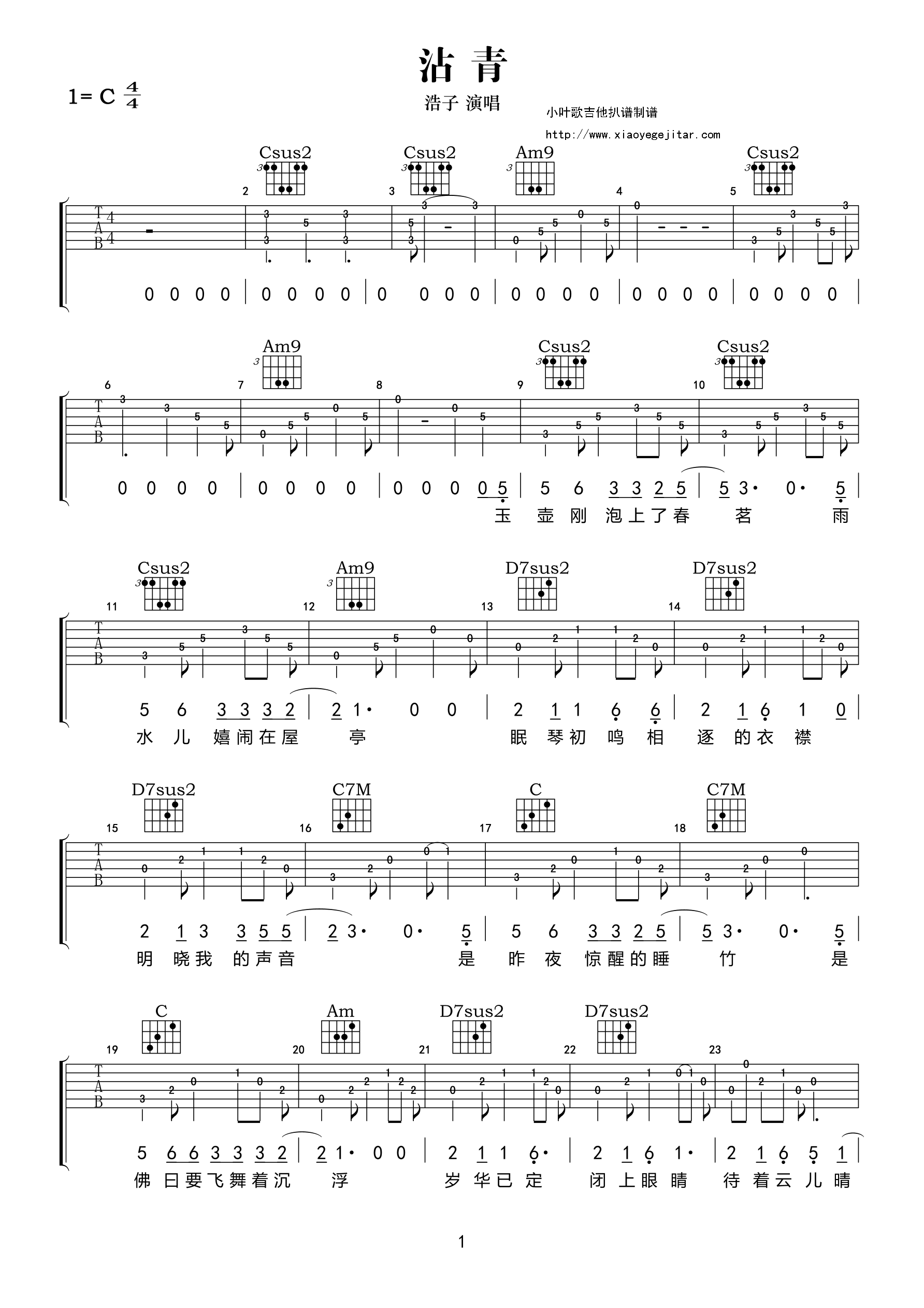 浩子《沾青》吉他谱,小叶歌编配出品,共有4张高清图谱。...