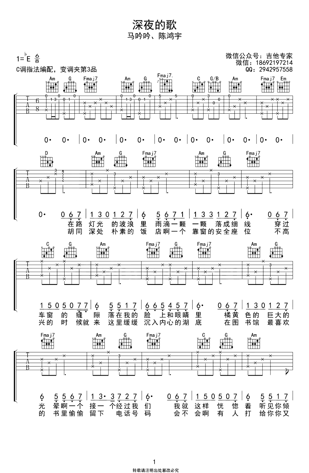 深夜的歌吉他谱_马吟吟/陈鸿宇_C调弹唱谱...