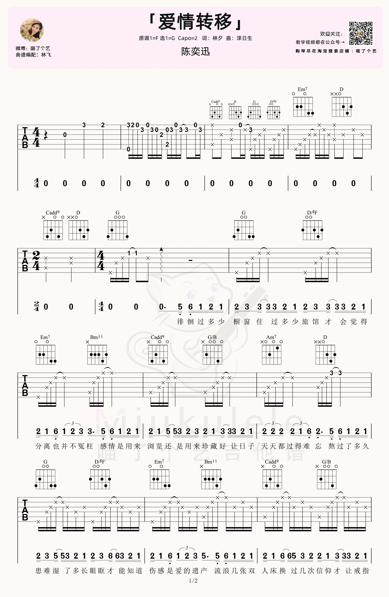 陈奕迅《爱情转移》吉他谱,洛阳山海吉他编配出品,共有2张高清图谱,免翻页排版设计。...