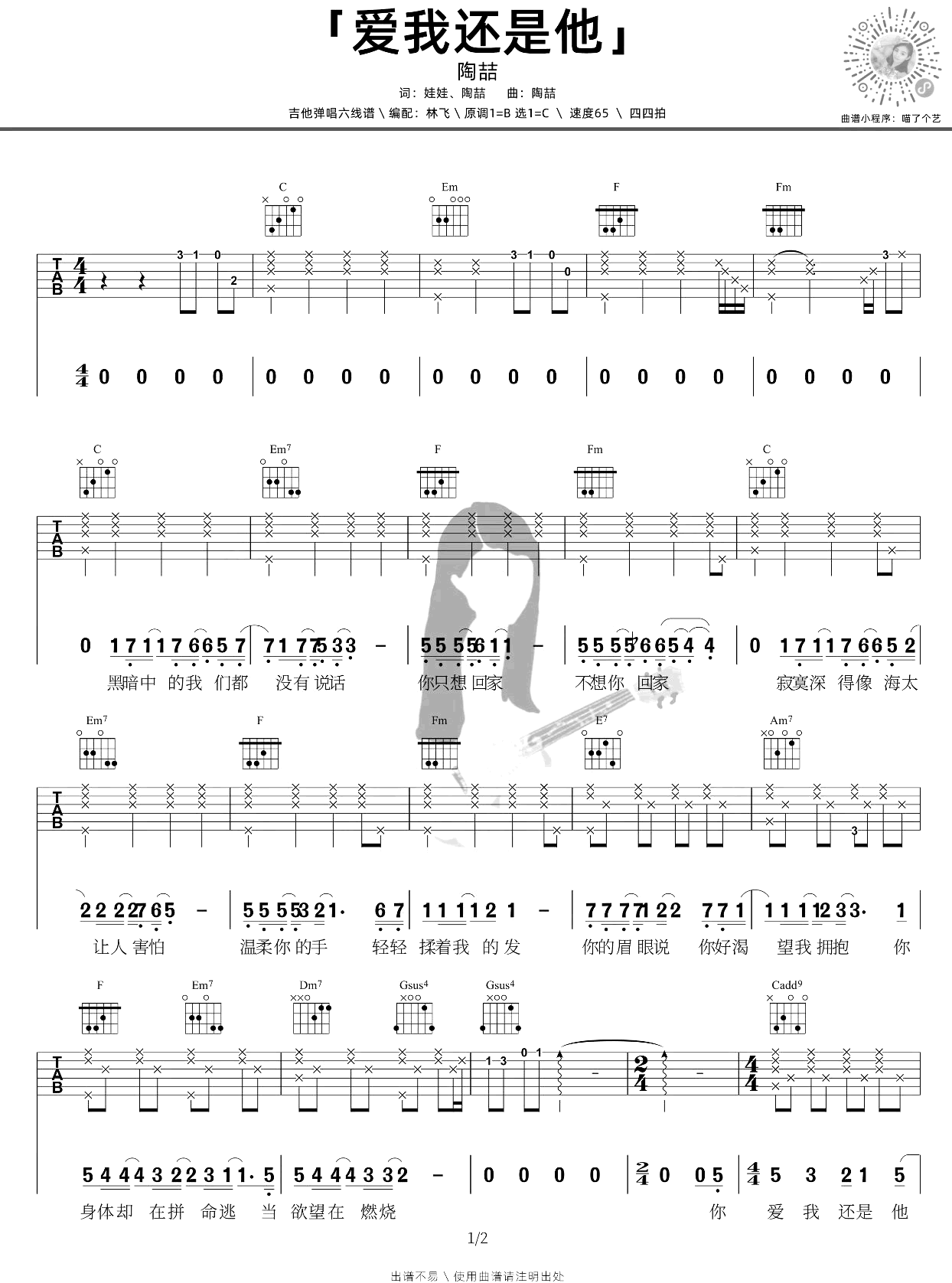 爱我还是他吉他谱,陶囱莩囊皇拙涓枨星槔锏娜窍疤猓兴芙獾每扛缴霞萄悠怠!栋一故撬芳咂祝B,选用C调指法编配,变调夹CAPO4品。四四拍节奏,演奏速度每分钟65拍,完整六线谱共两张图片,感谢喵了个艺出品,酷玩吉他整理上传。 以沉静的悲伤叙述,演绎着一段三角恋的故事,爱情中不...