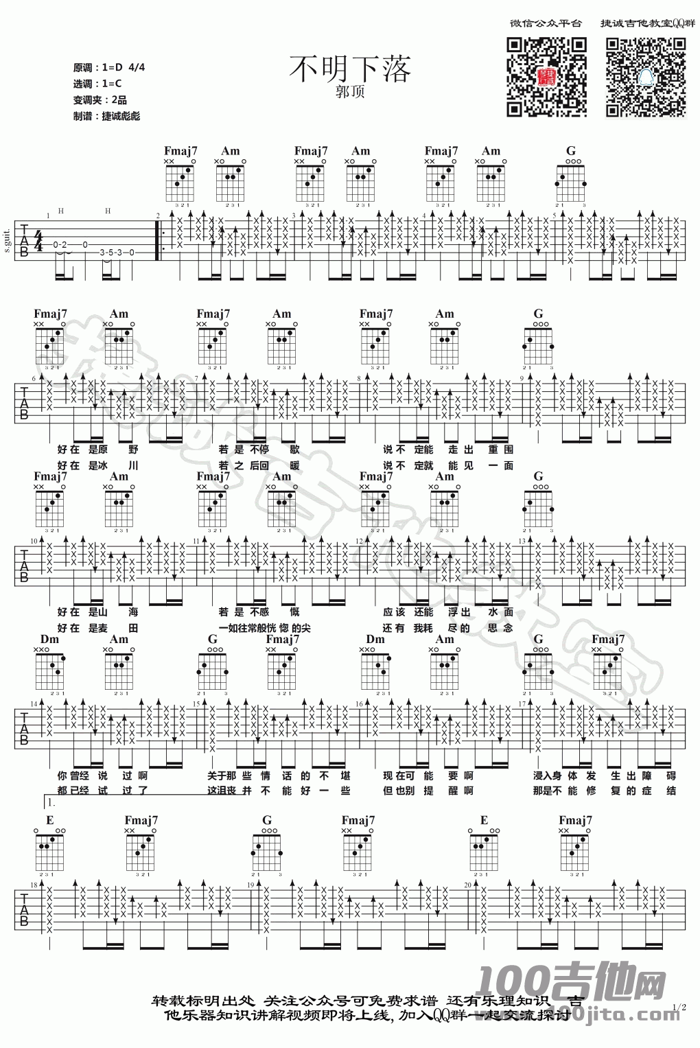 王巨星《下落不明_王巨星_C调》尤克里里谱,共有2张高清图谱,免翻页排版设计。...