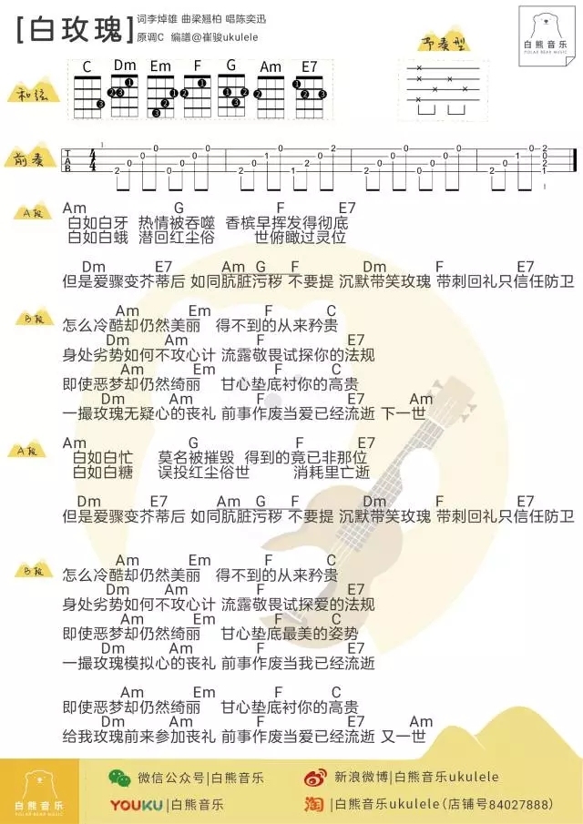 陈奕迅《白玫瑰》尤克里里谱弹唱版C调和弦谱...