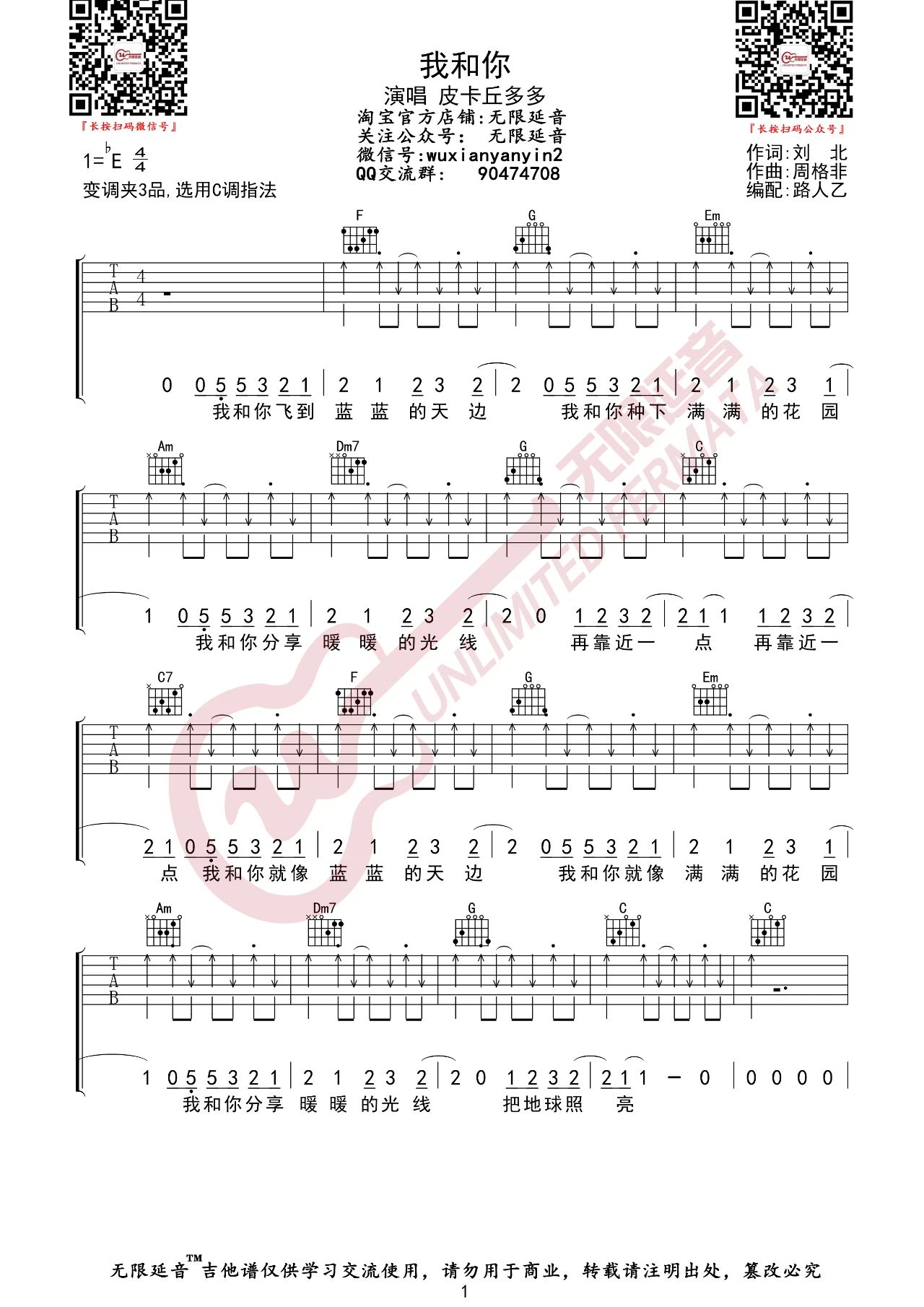 吉他皮卡丘多多《我和你》吉他谱 C调弹唱谱