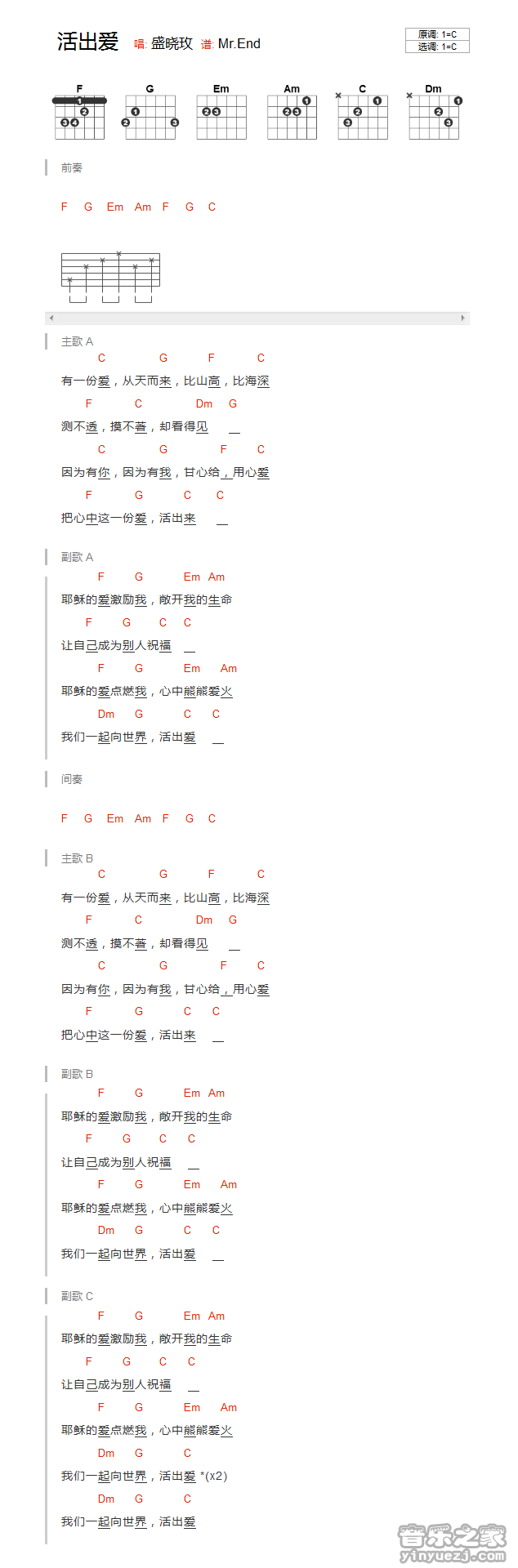吉他盛晓玫《活出爱》吉他谱_吉他弹唱谱