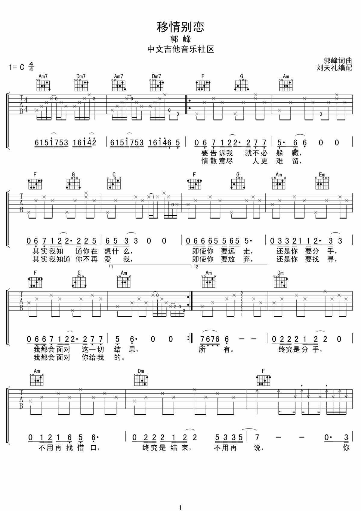 郭峰《移情别恋》吉他谱_C调弹唱谱...