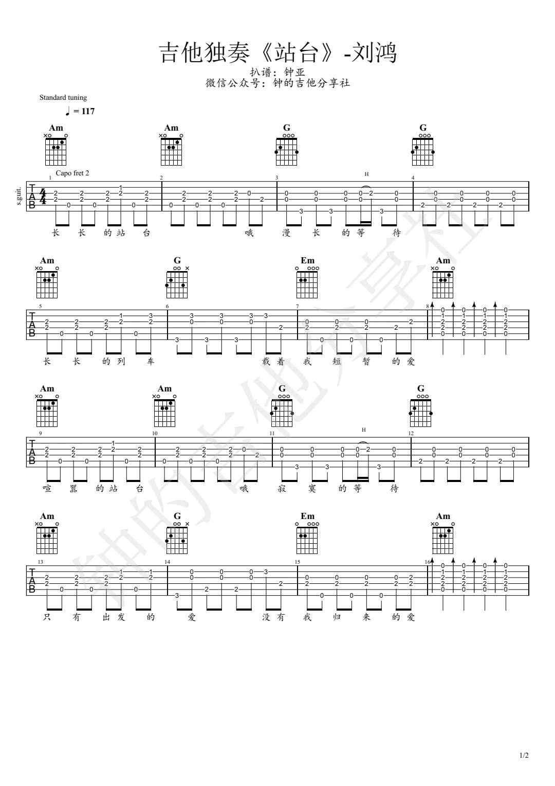 刘鸿《站台》吉他谱,共有2张高清图谱,免翻页排版设计。...