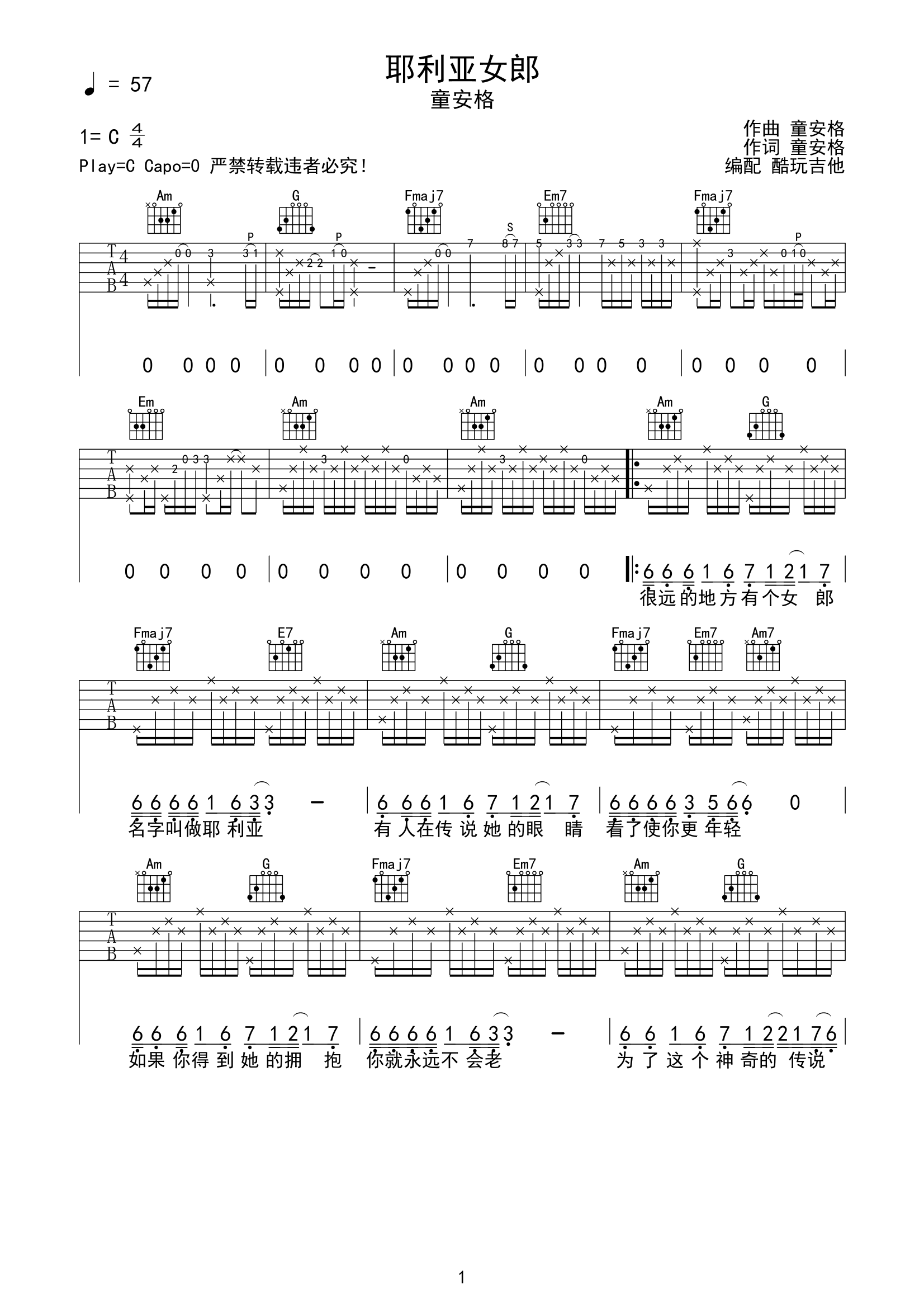 吉他童安格《耶利亚女郎》吉他谱-C调弹唱谱最完整还原版