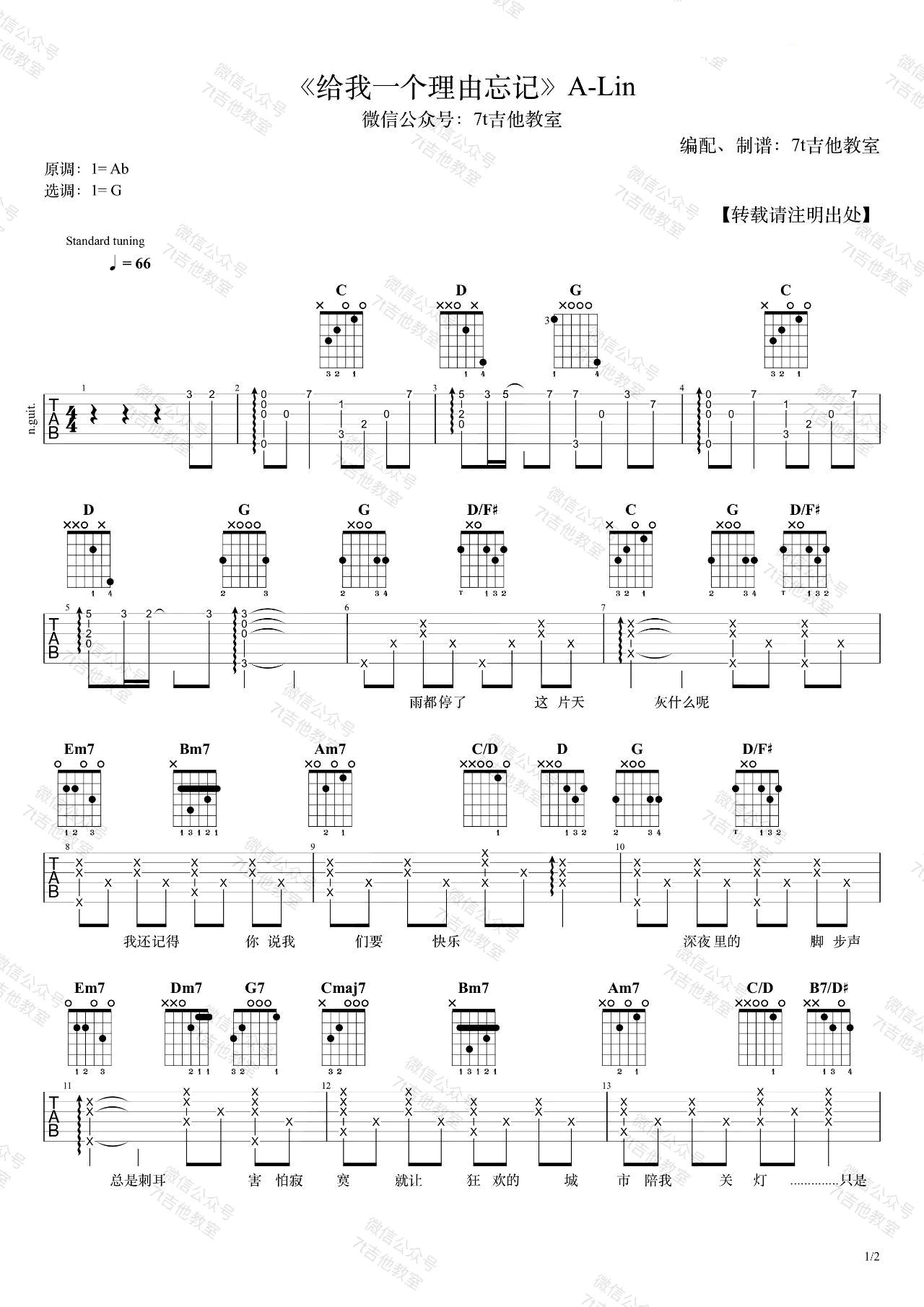 给我一个理由忘记吉他谱,A-Lin黄丽玲演唱的一首经典作品。醇厚的歌声缓缓流淌,将那些难以割舍的晦涩情感表达出来。《给我一个理由忘记》吉他弹唱谱,原调升G,选用G调指法,变调夹capo1品,完整编配共三张高清图片六线谱,感谢晓涛吉他出品,酷玩吉他上传更新。这首伤感情歌确实非常动人...