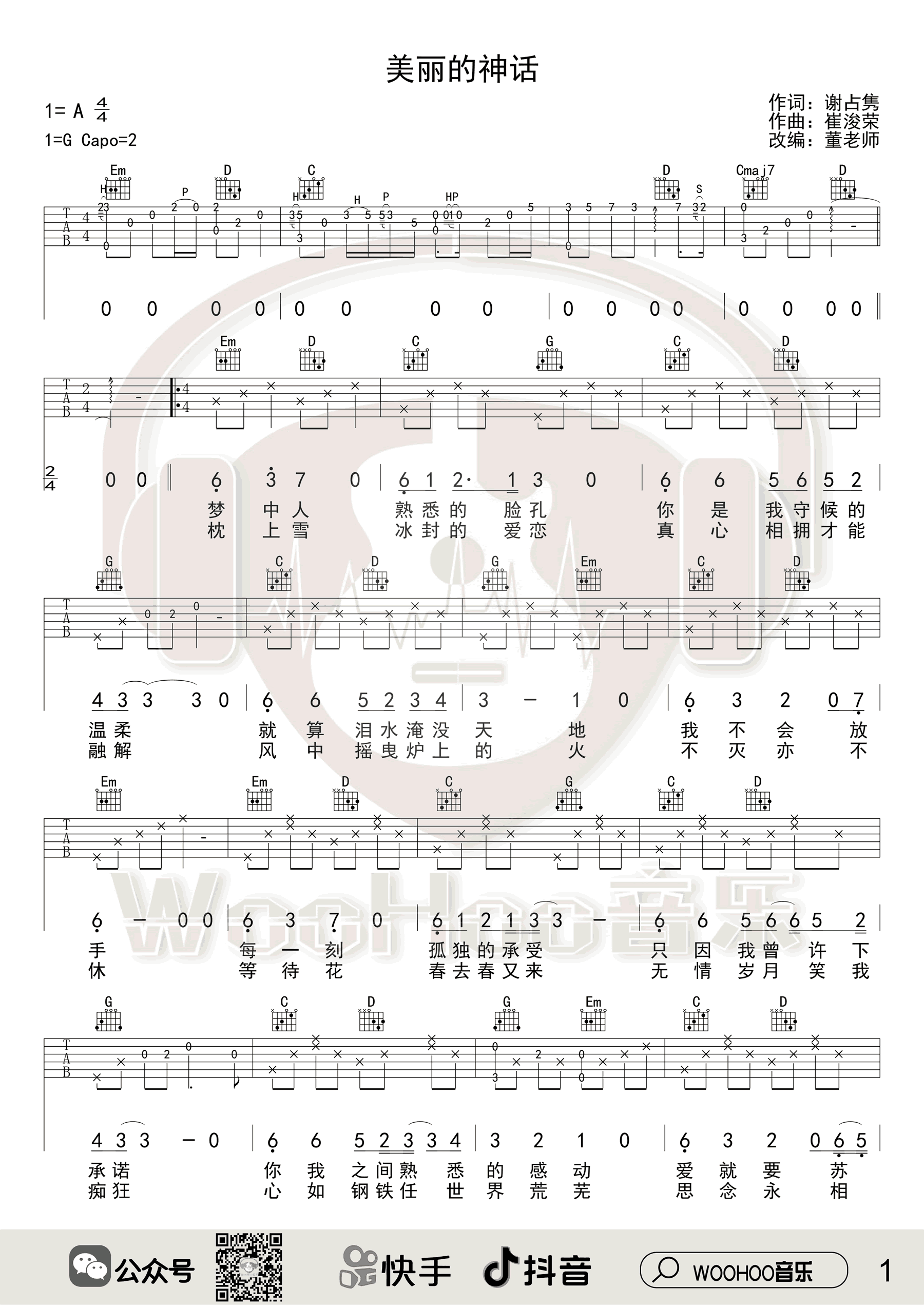 孙楠/韩红《美丽的神话》吉他谱,钟亚编配出品,共有4张高清图谱。...