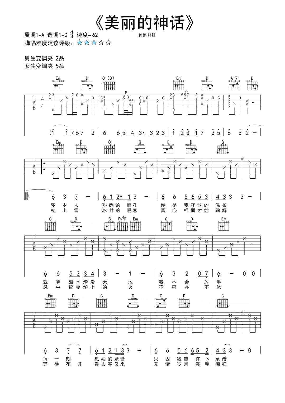 孙楠/韩红《美丽的神话》吉他谱G调弹唱谱...