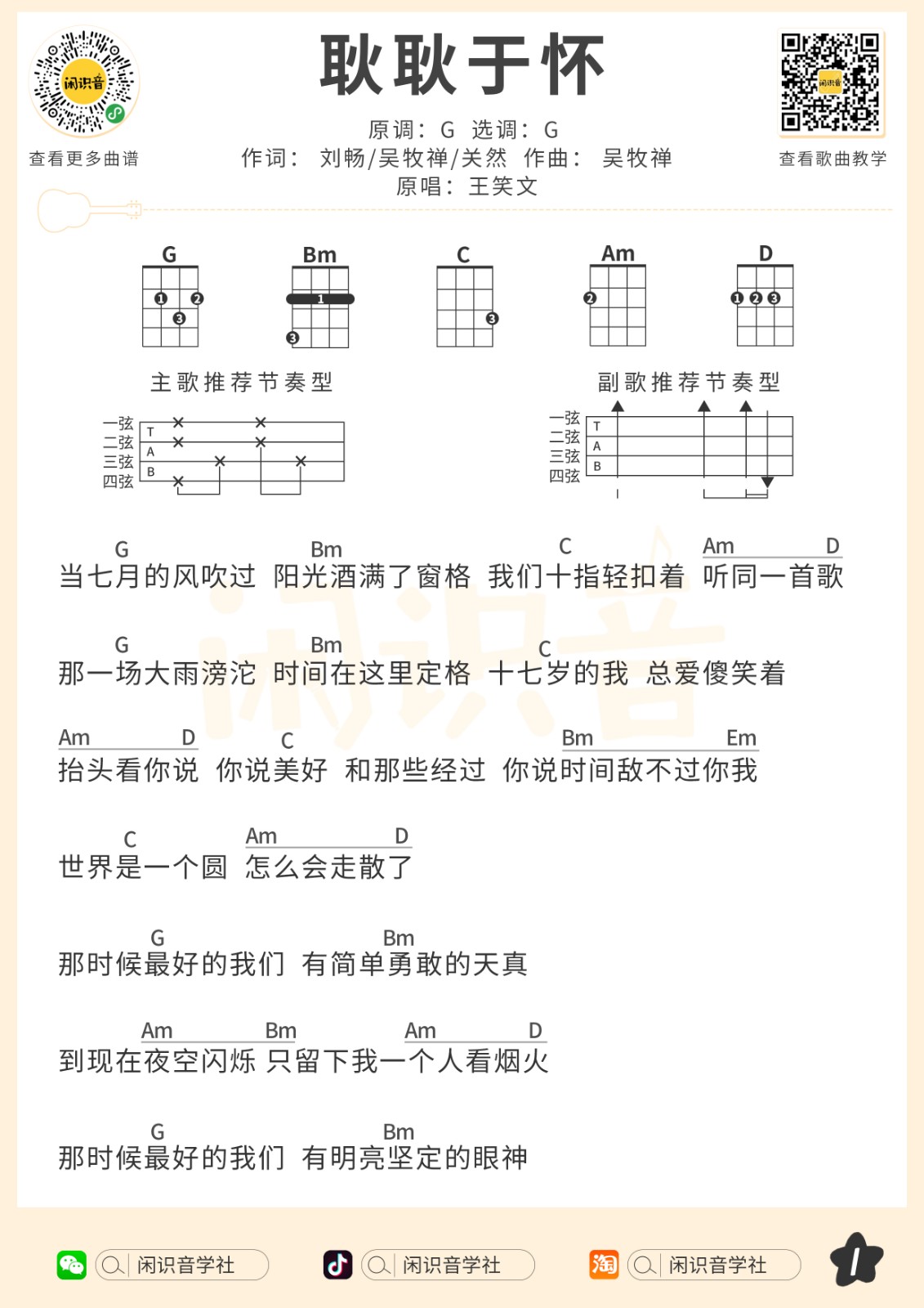 吴牧禅《耿耿于怀》尤克里里曲谱-G调弹唱谱...