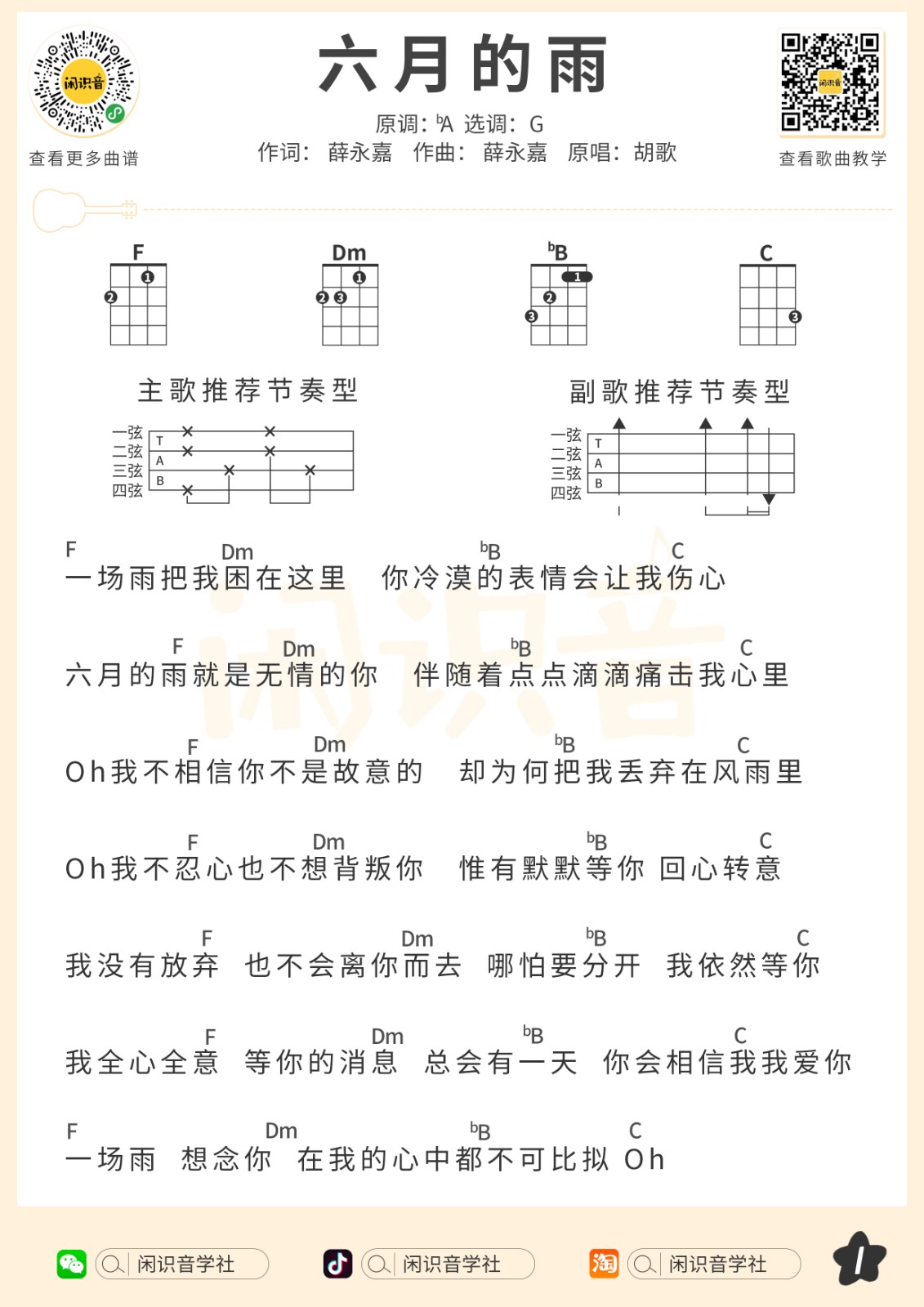 尤克里里胡歌《六月的雨》尤克里里曲谱-G调弹唱谱