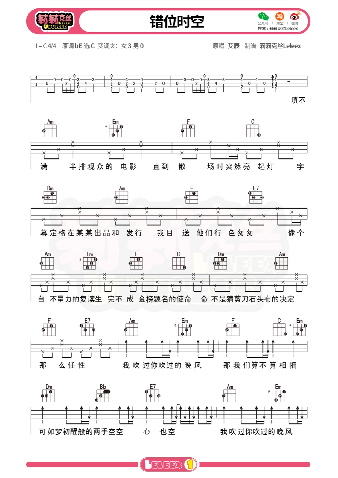 尤克里里艾辰《错位时空》尤克里里弹唱曲谱(标准四线谱)莉莉克丝Leleex