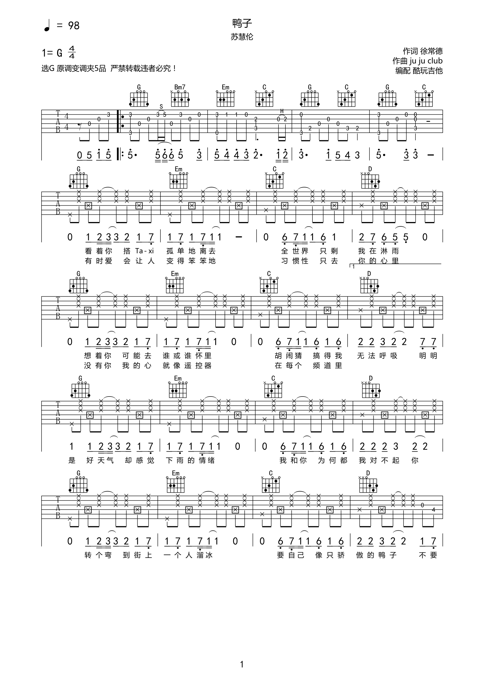 吉他苏慧伦《鸭子》吉他谱-G调六线谱弹唱谱附前奏间奏尾奏