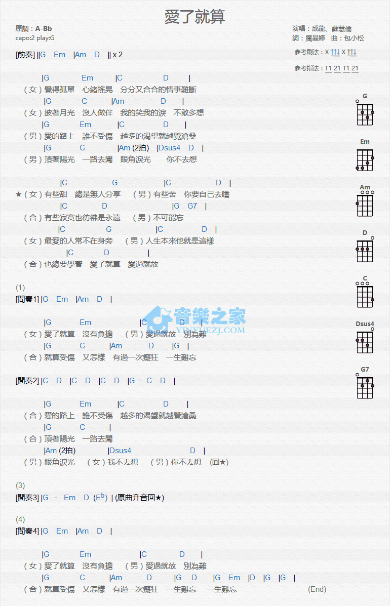 苏慧伦《爱了就算》尤克里里谱-G调弹唱谱...