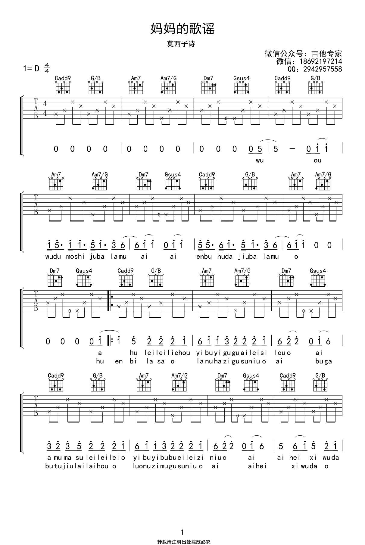 妈妈的歌谣吉他谱_莫西子诗_D调_弹唱六线谱选用D调原版编配,六线谱共三张图片。...