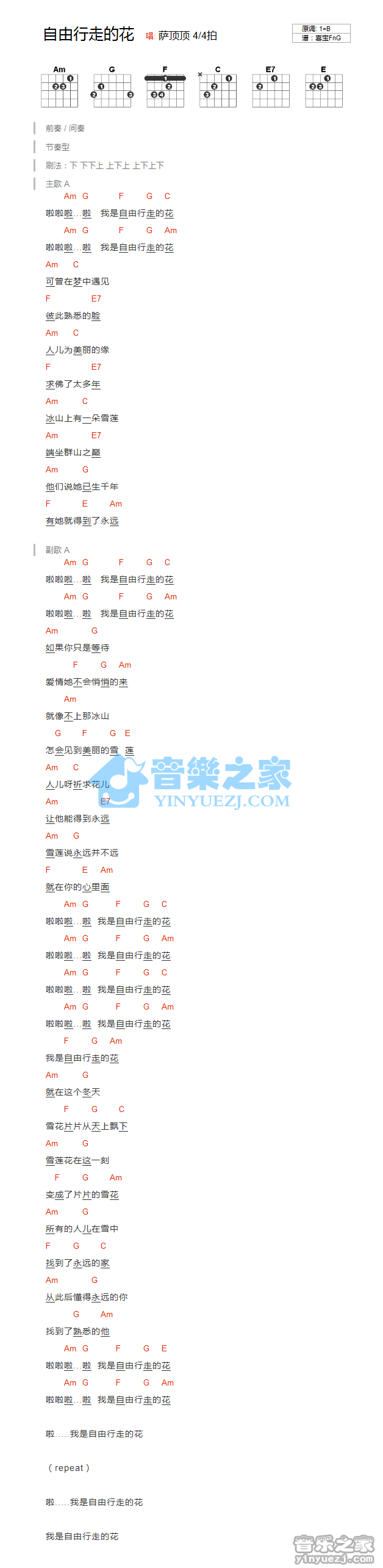 吉他萨顶顶《自由行走的花》吉他谱_吉他弹唱谱_YYZJ编配