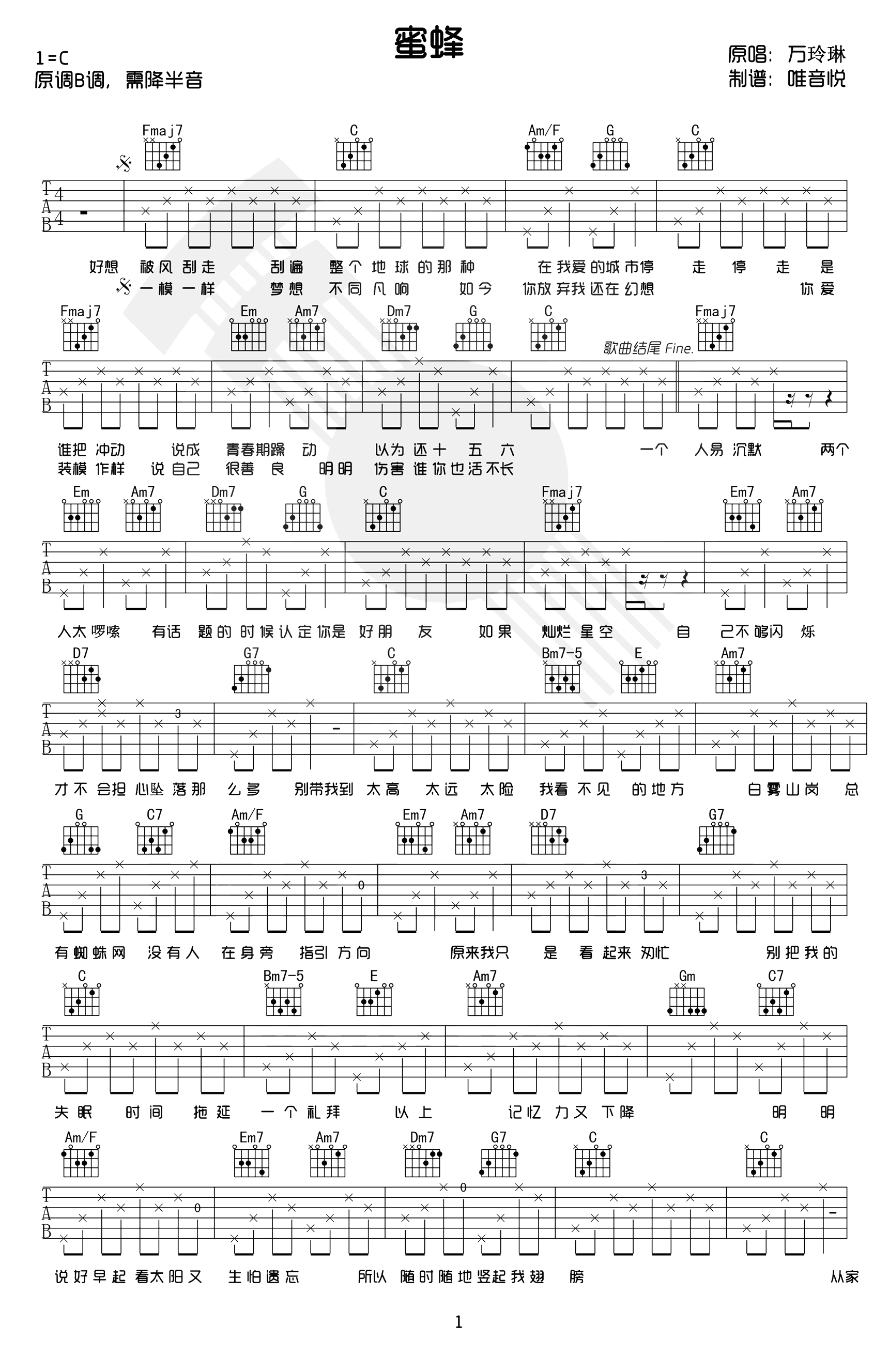 吉他万玲琳《蜜蜂》吉他谱_吉他弹唱谱_唯音悦编配