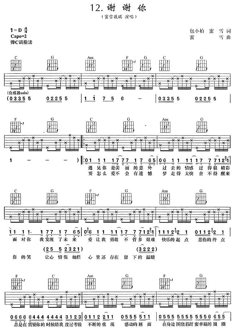 蜜雪薇琪《谢谢你》吉他谱D调六线谱...