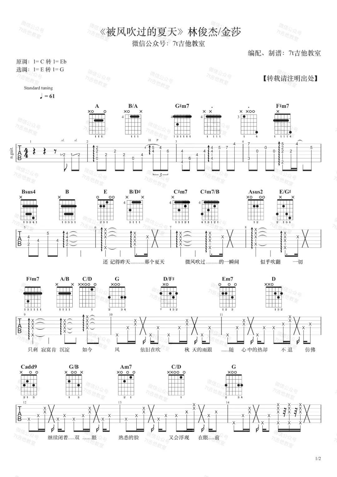 林俊杰/金莎《被风吹过的夏天》吉他谱E调弹唱谱...