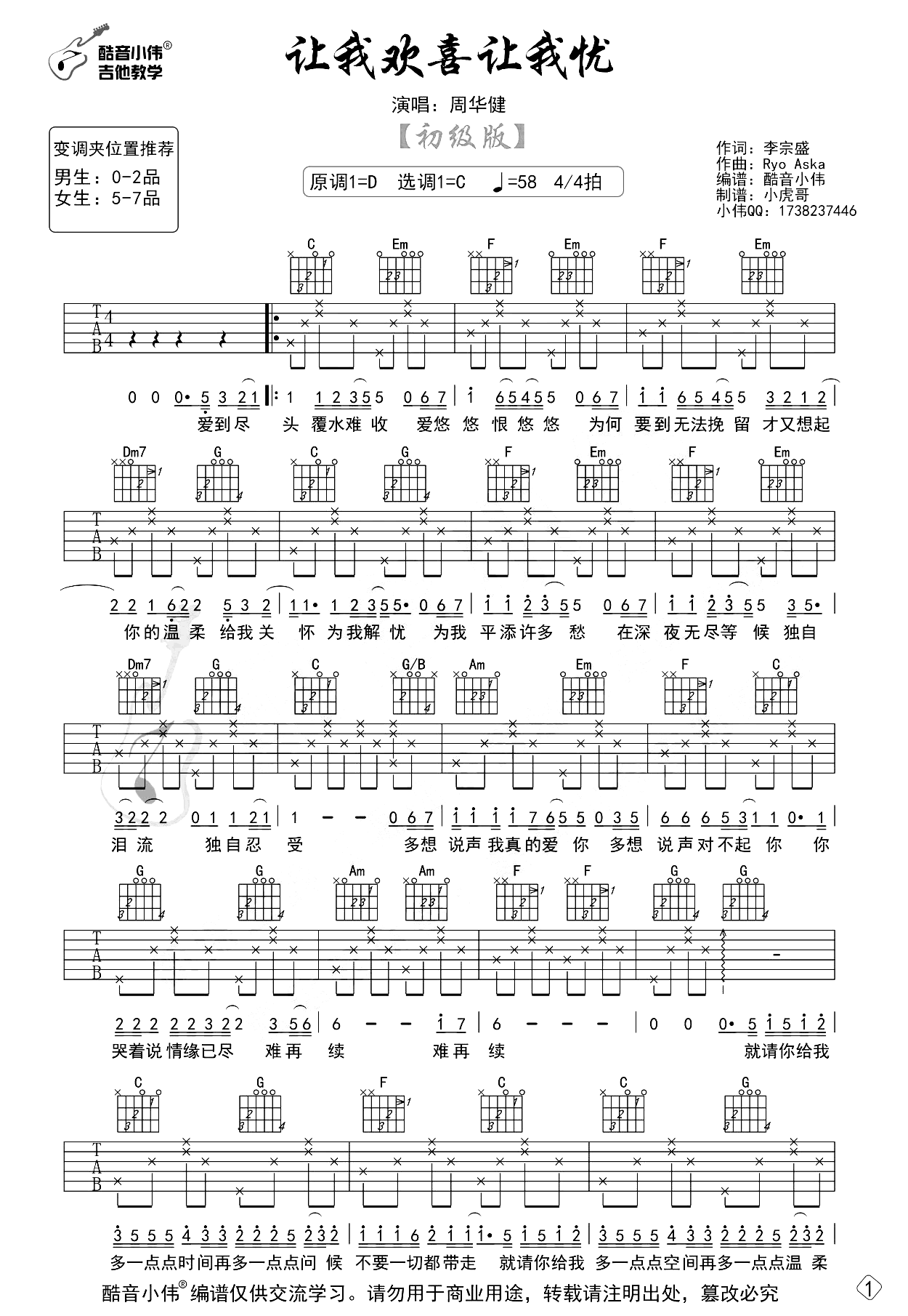 让我欢喜让我忧吉他谱,周华健的一首经典老歌,初级版编配,薛之谦也在《中国好声音》舞台深情演绎,覆水难收。《让我欢喜让我忧》吉他弹唱谱,原调D调,选用C调指法,变调夹推荐男生0-2品女生5-7品,共两张图片六线谱,感谢酷音小伟出品,酷玩吉他上传。优美的词曲娓娓述说一段充满痛苦的离别...