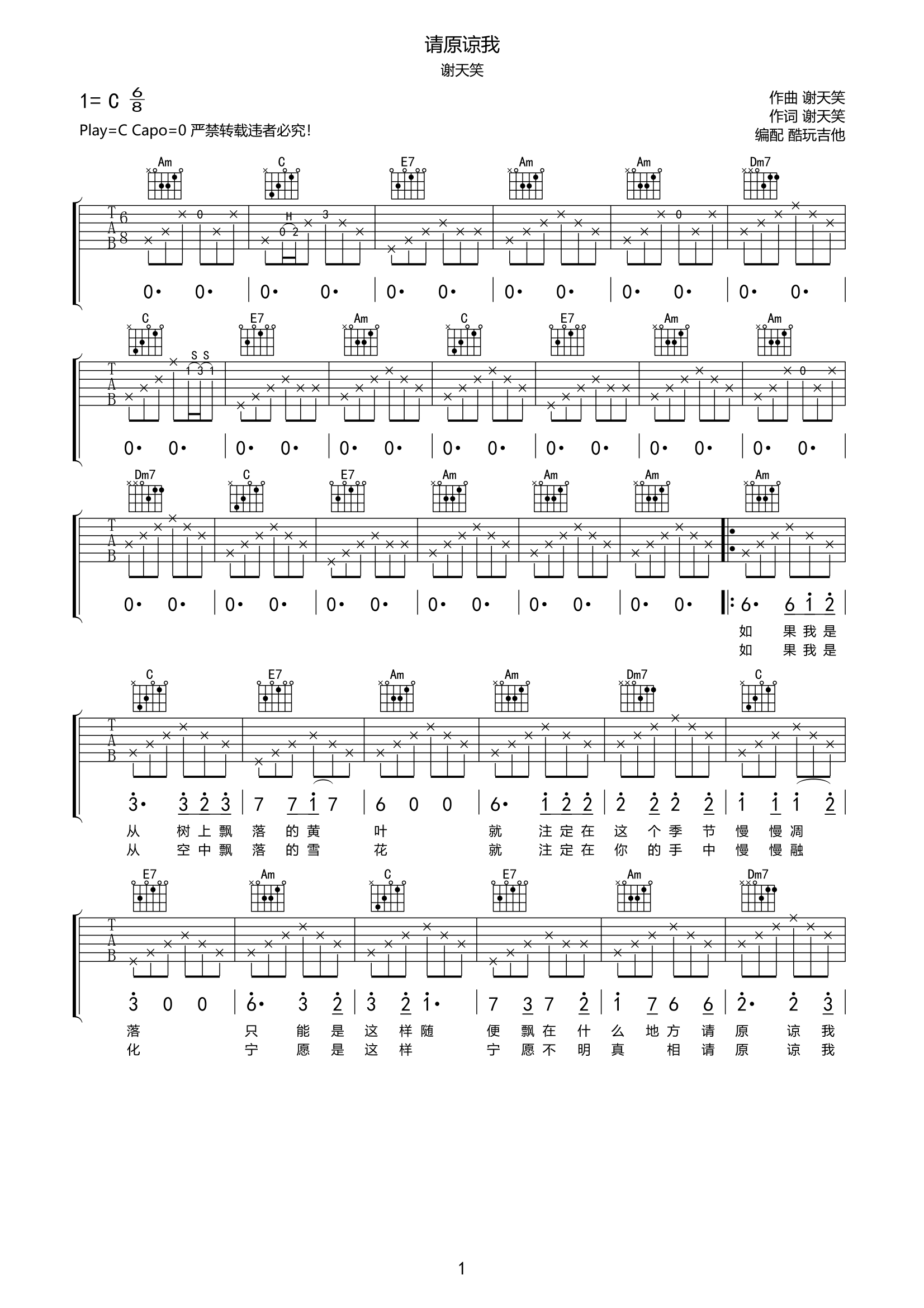 谢天笑《我原谅你》吉他谱-C调弹唱谱高清...