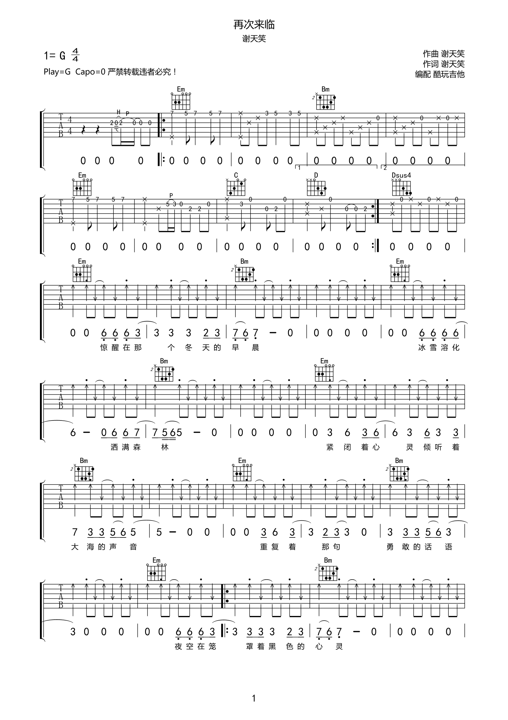 吉他谢天笑《再次来临》吉他谱-G调弹唱原版谱