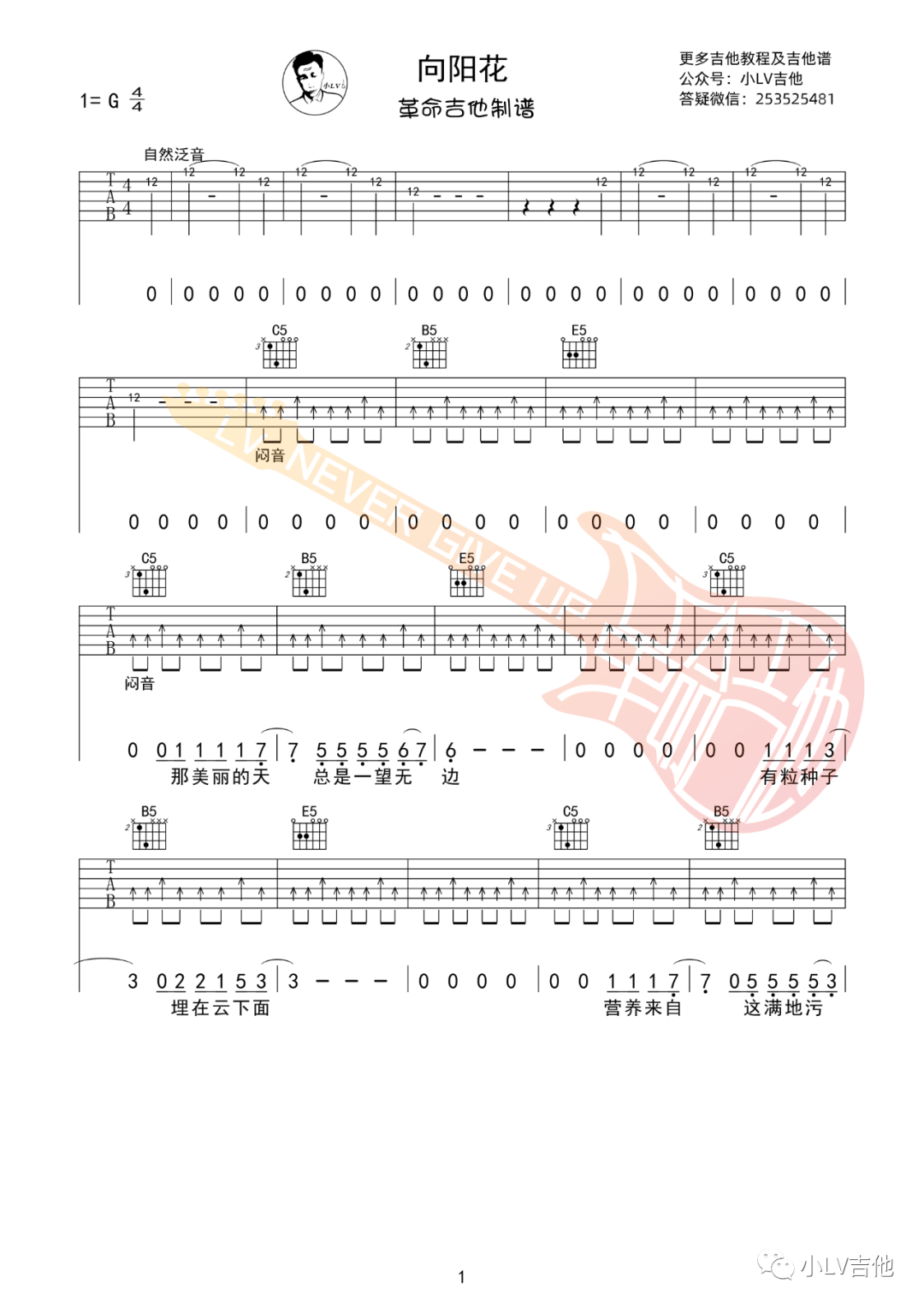 谢天笑《向阳花》吉他谱,革命吉他编配出品,共有3张高清图谱。...
