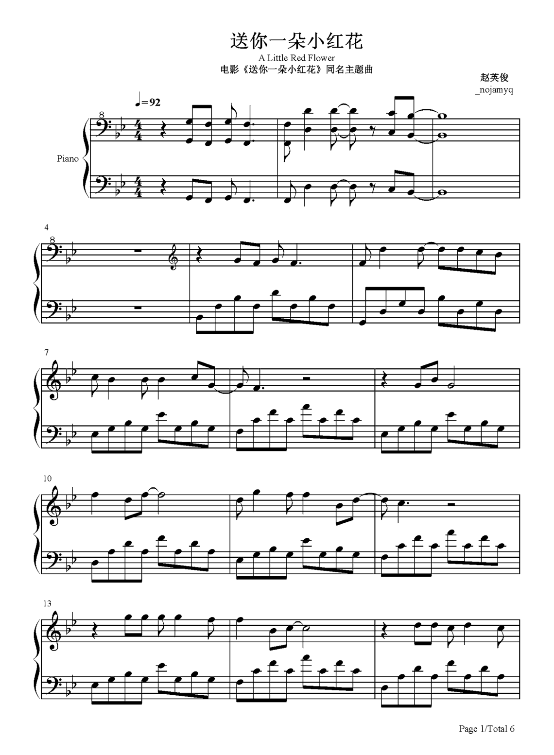 电影《送你一朵小红花》同名主题曲钢琴谱...