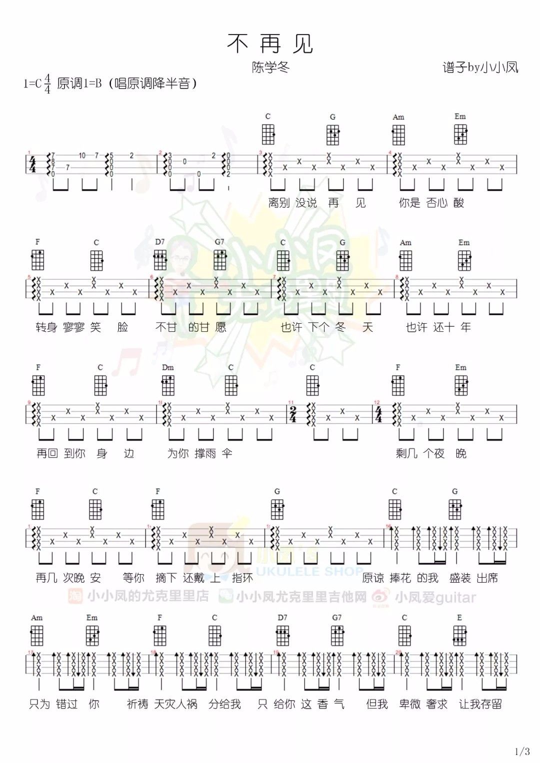 陈学冬《不再见》尤克里里谱C调弹唱版...