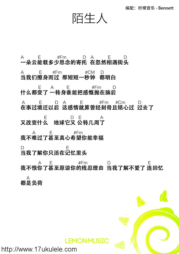 《陌生人》尤克里里谱,共有1张高清图谱,免翻页排版设计。...