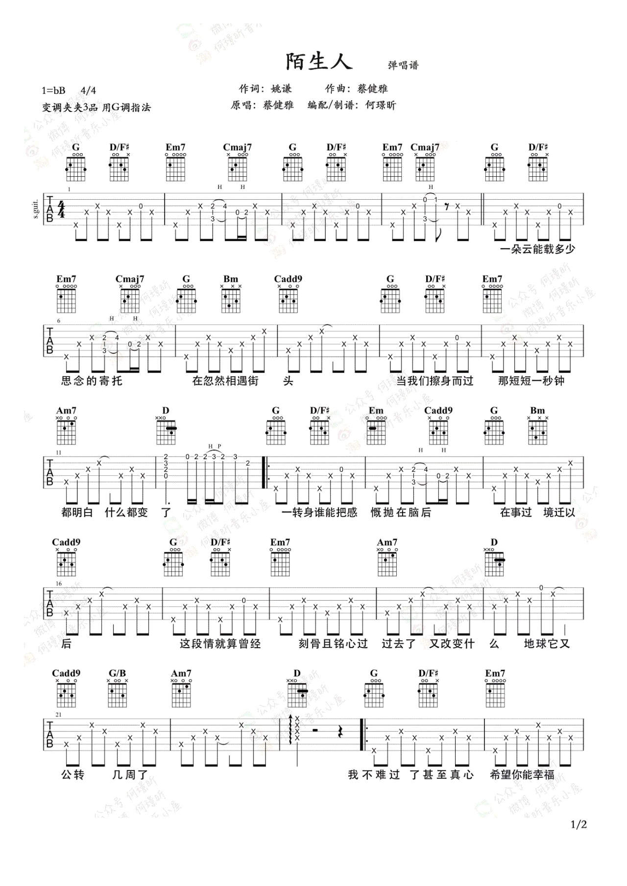 蔡健雅《陌生人》吉他谱,何璟昕编配出品,共有2张高清图谱,免翻页排版设计。...