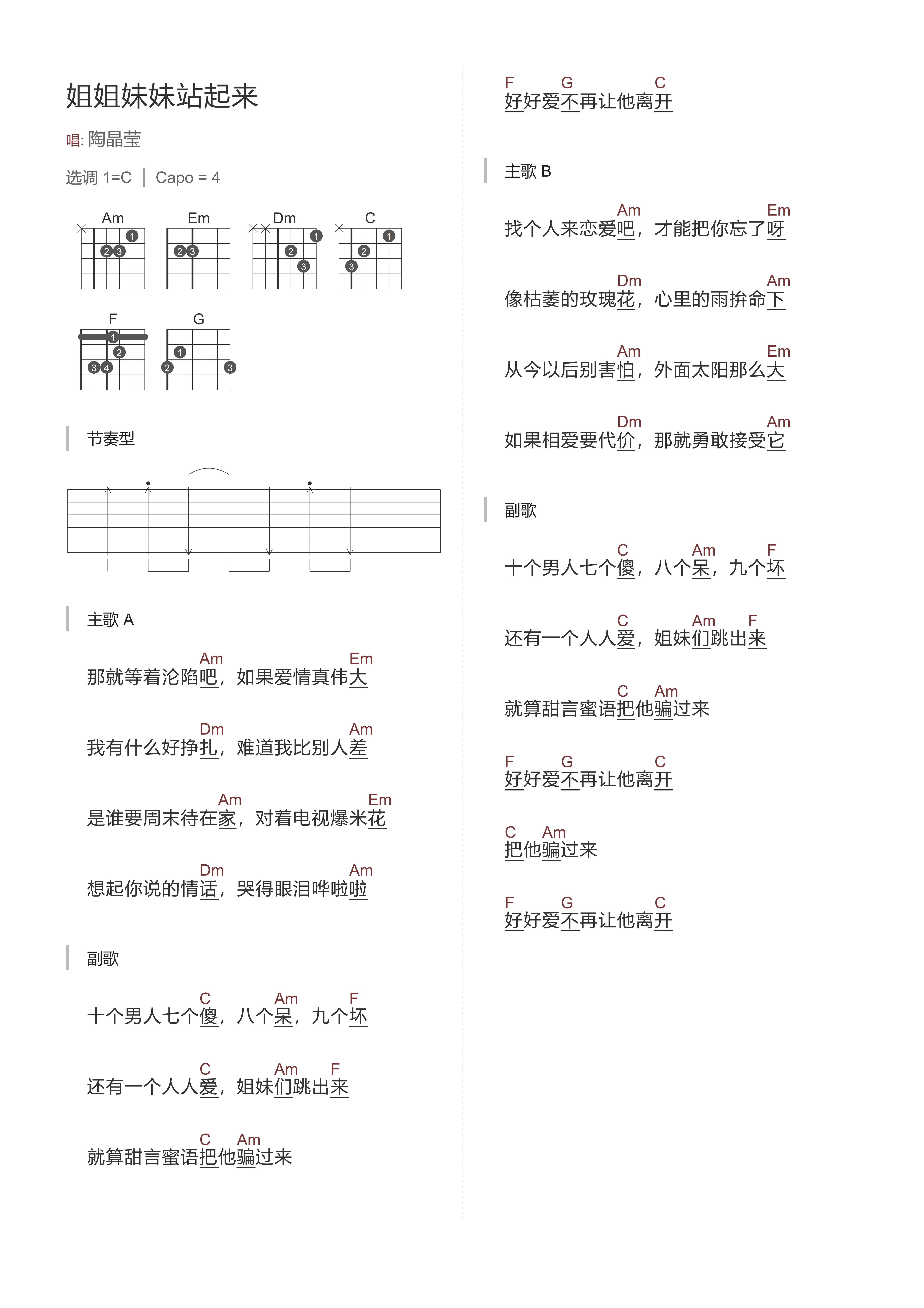 吉他陶晶莹《姐姐妹妹站起来》吉他谱_吉他弹唱谱