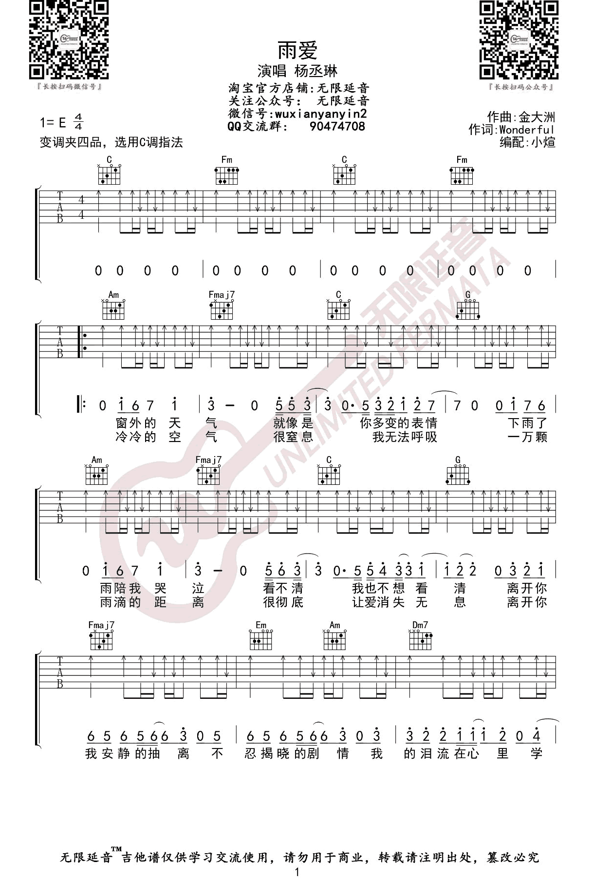 杨丞琳《雨爱》吉他谱-C调弹唱六线谱...