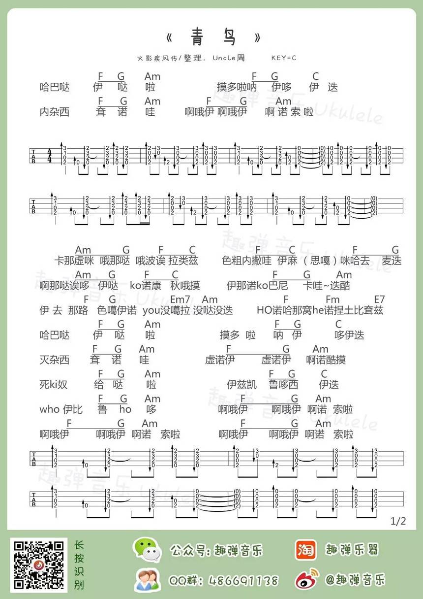 火影忍者OP《青鸟》尤克里里弹唱谱...
