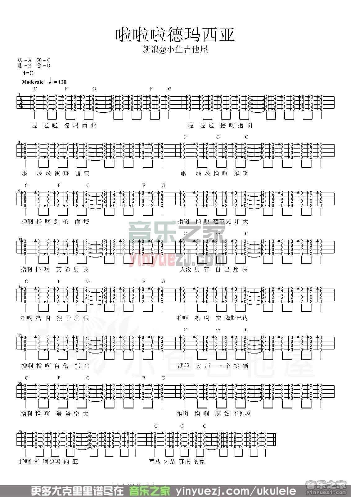 音频怪物《啦啦啦德玛西亚》尤克里里谱指弹版A调六线谱_音频怪物...