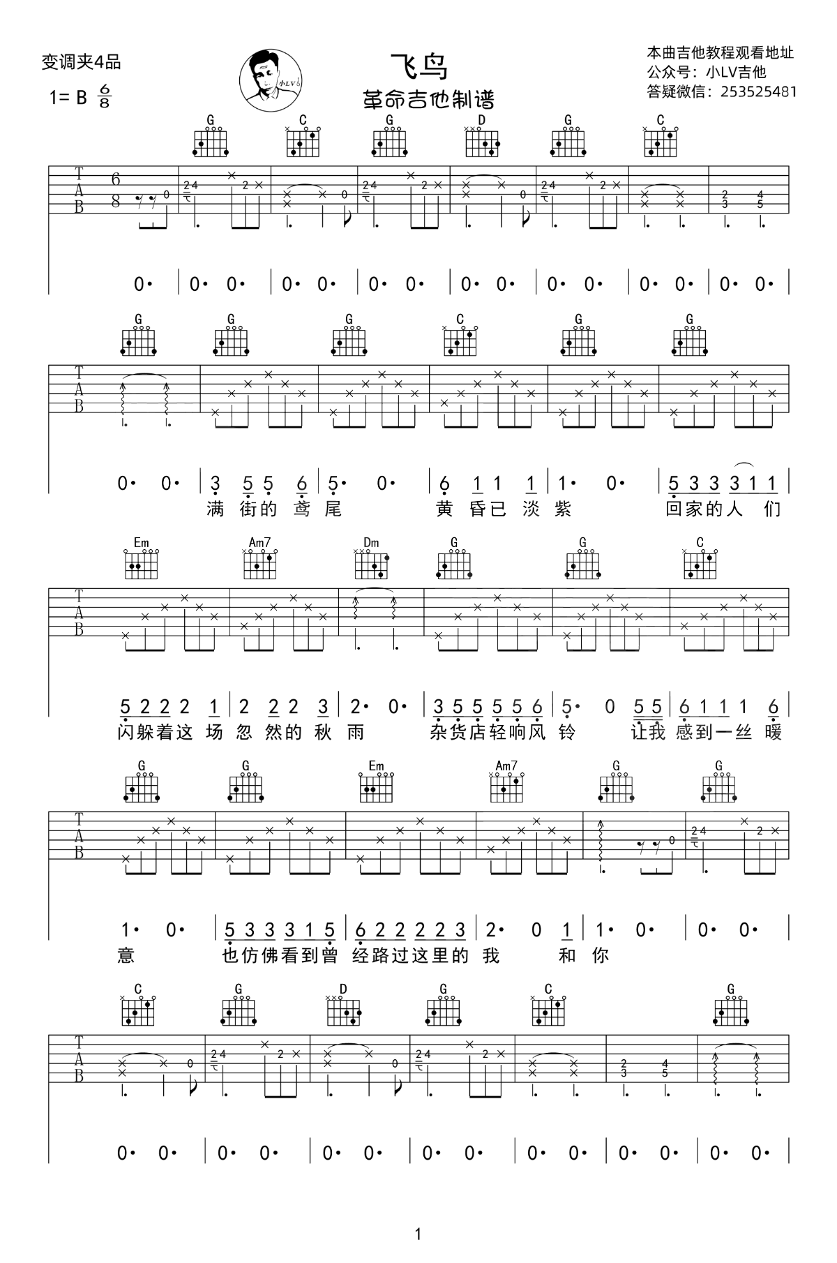 琴友订制,飞鸟吉他谱-曲木阿依-G调六线谱弹唱选G变调夹1品海来阿木词曲新作根据琴友要求编配相对简单音频为手机录制完整谱面录制重复段落没有录自己演奏请按照重复段落弹唱...