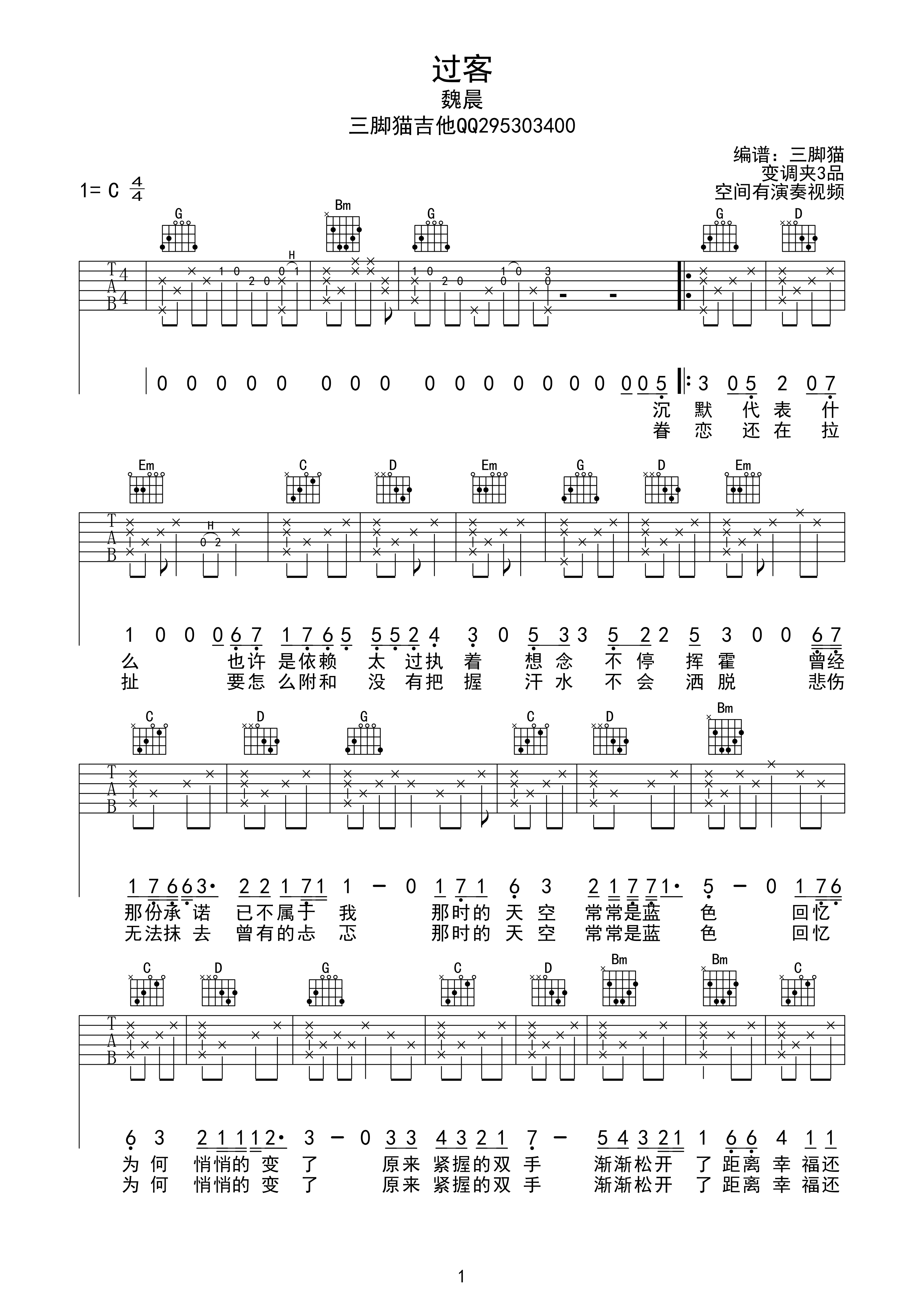 魏晨《过客》吉他谱,三脚猫编配出品,共有2张高清图谱,免翻页排版设计。...