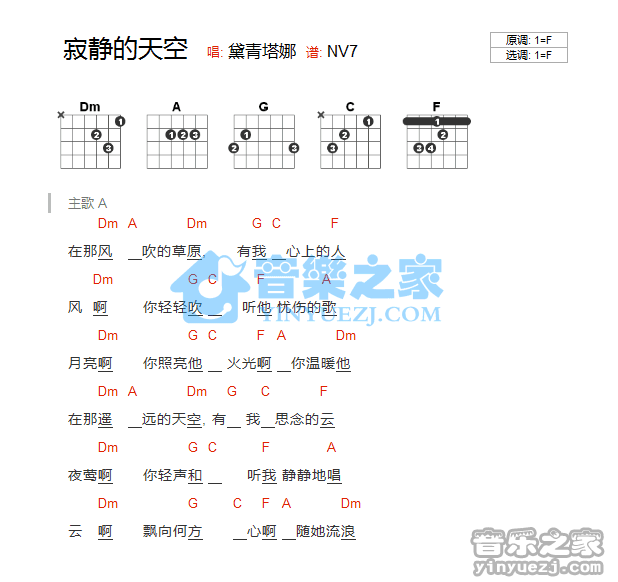 F调版黛青塔娜《寂静的天空》吉他和弦弹唱谱...