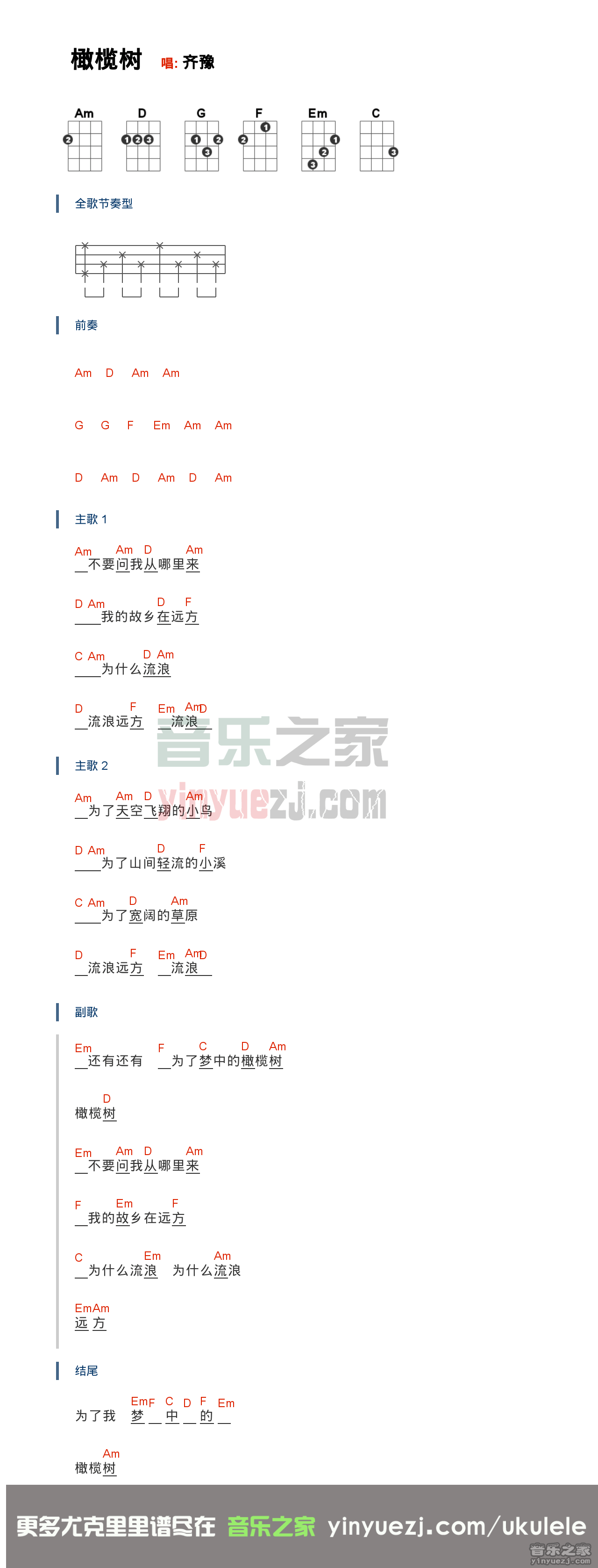 齐豫《橄榄树》尤克里里谱弹唱版A调女生版_音乐之家编配_齐豫...