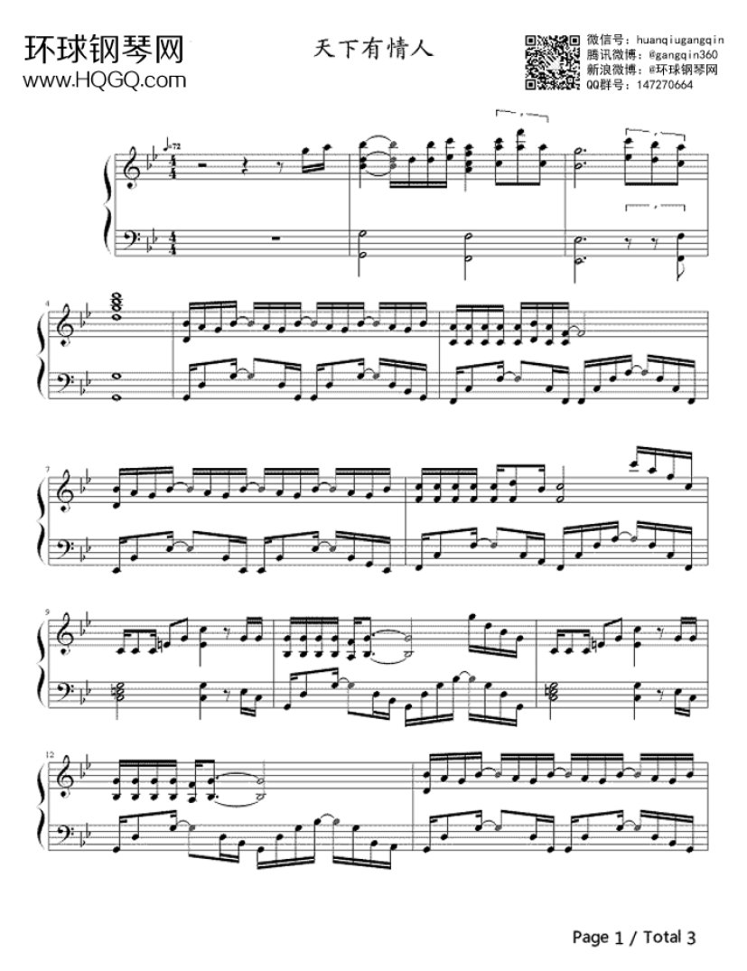 钢琴周华健、齐豫《天下有情人》钢琴谱