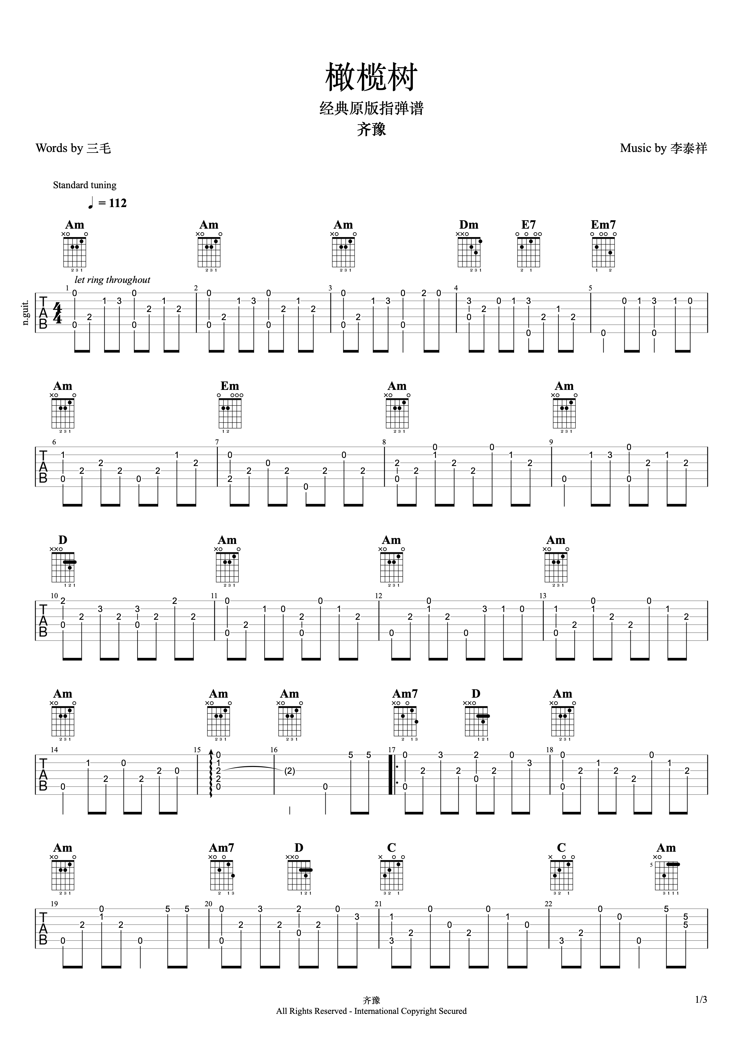 吉他齐豫《橄榄树》吉他谱_吉他指弹六线谱