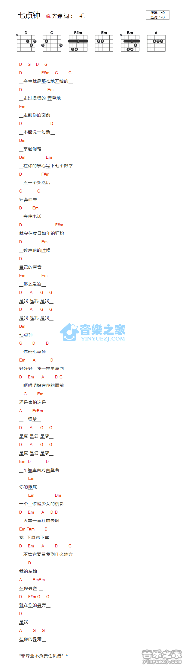 D调版齐豫《七点钟》吉他和弦弹唱谱...