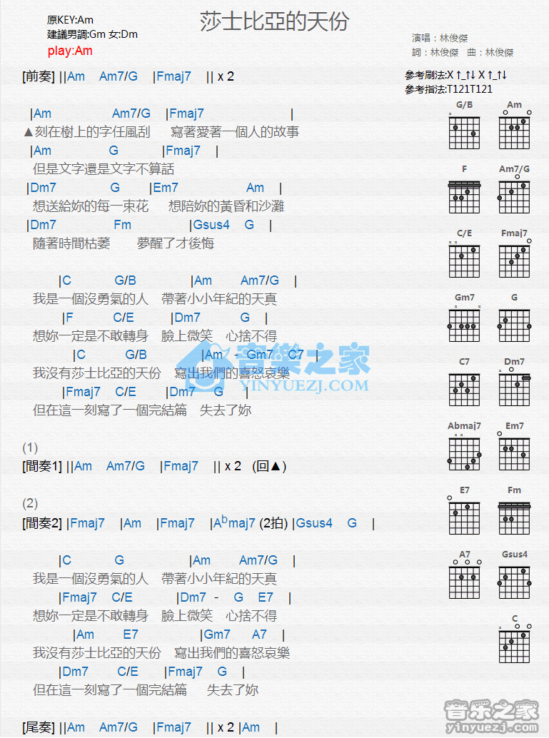 Am调版《莎士比亚的天份》吉他和弦弹唱谱...