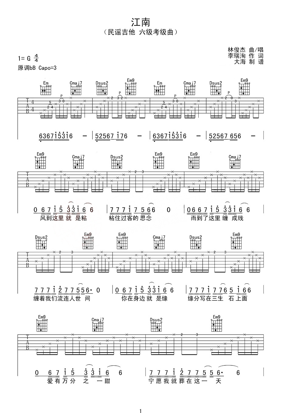 吉他林俊杰《江南》吉他谱_吉他弹唱谱_大海编配