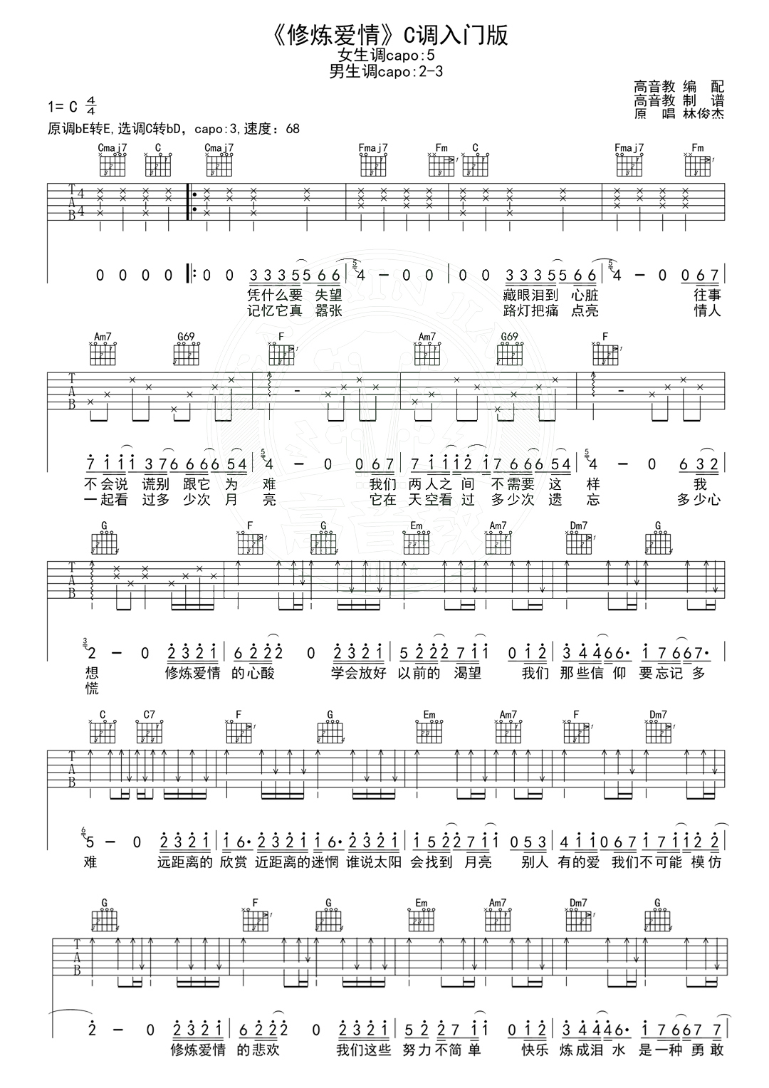 吉他林俊杰《修炼爱情》吉他谱_吉他弹唱谱_高音教编配