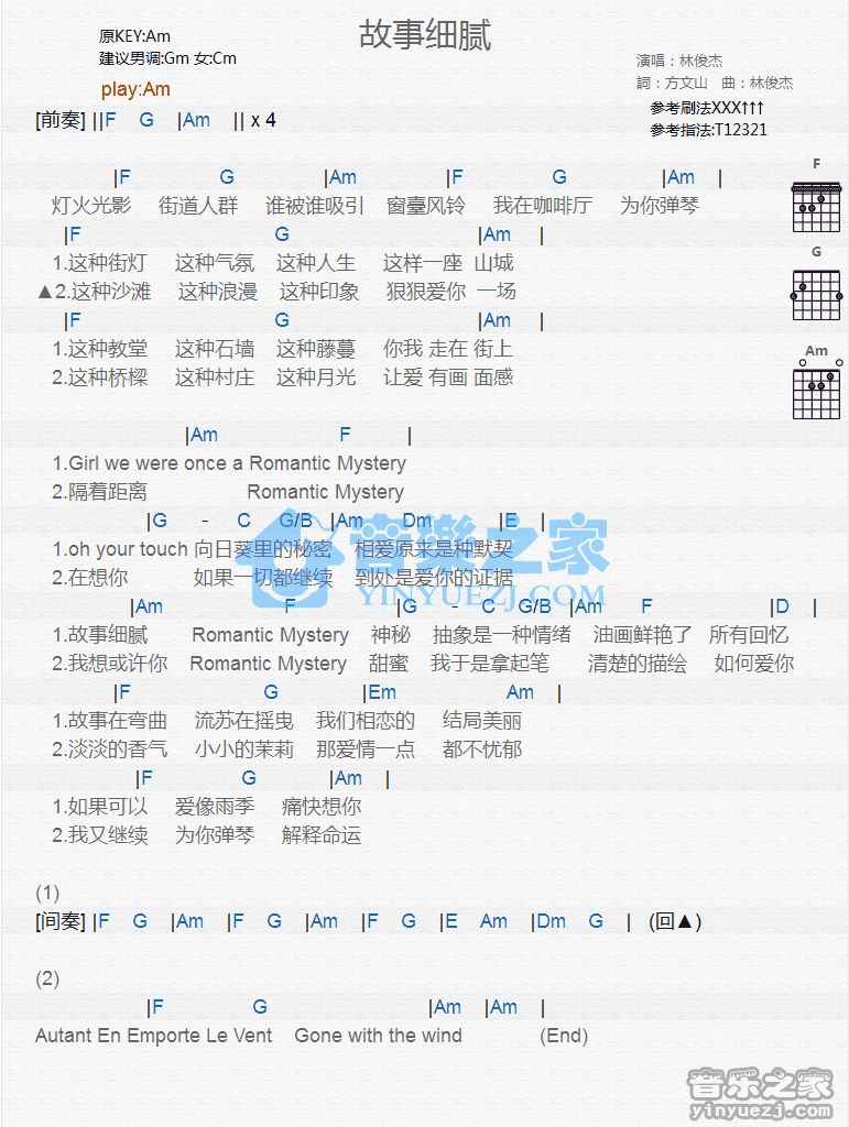 Am调版林俊杰《故事细腻》吉他和弦弹唱谱...