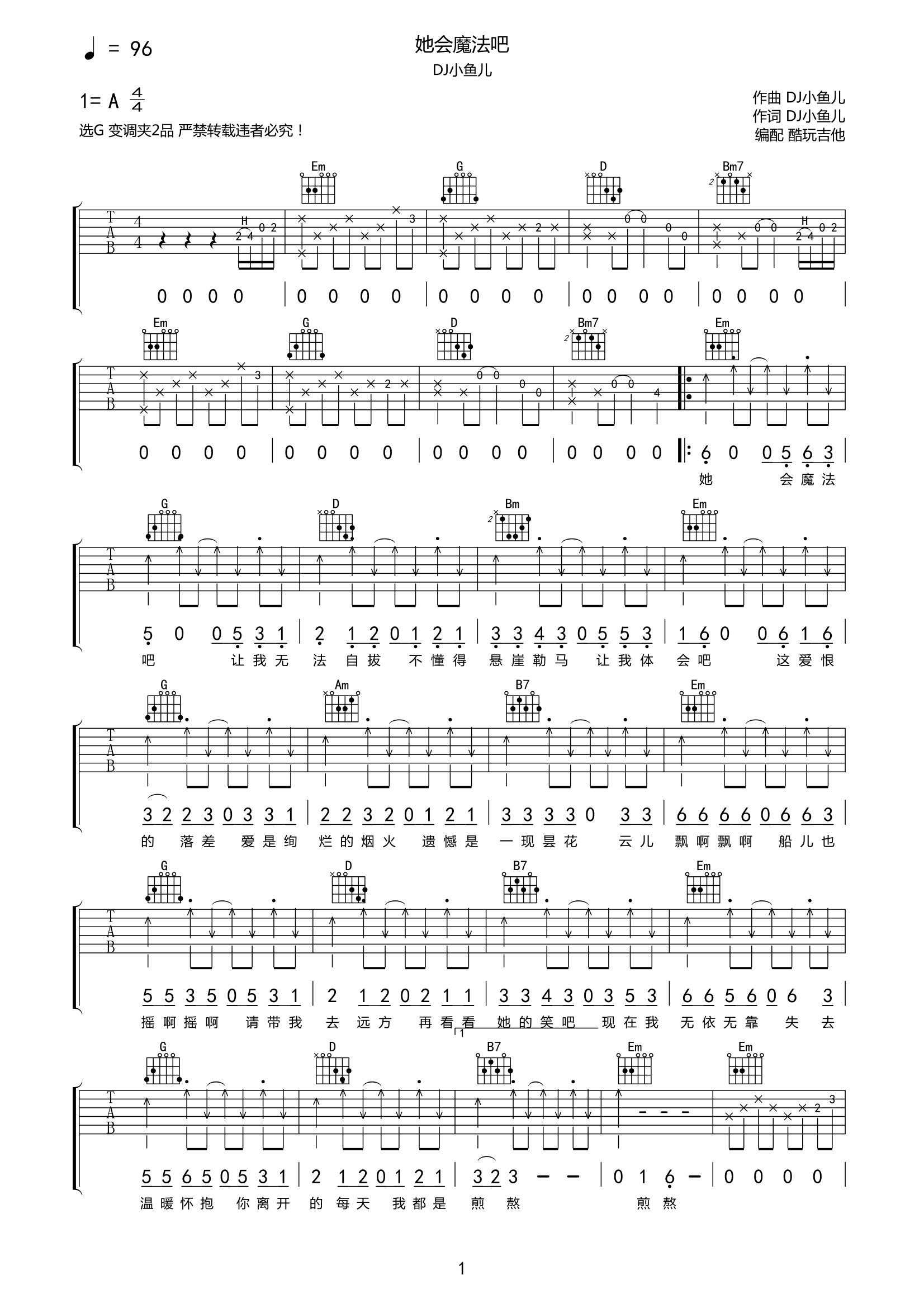 吉他DJ小鱼儿《她会魔法吧》吉他谱-G调弹唱谱高清原版