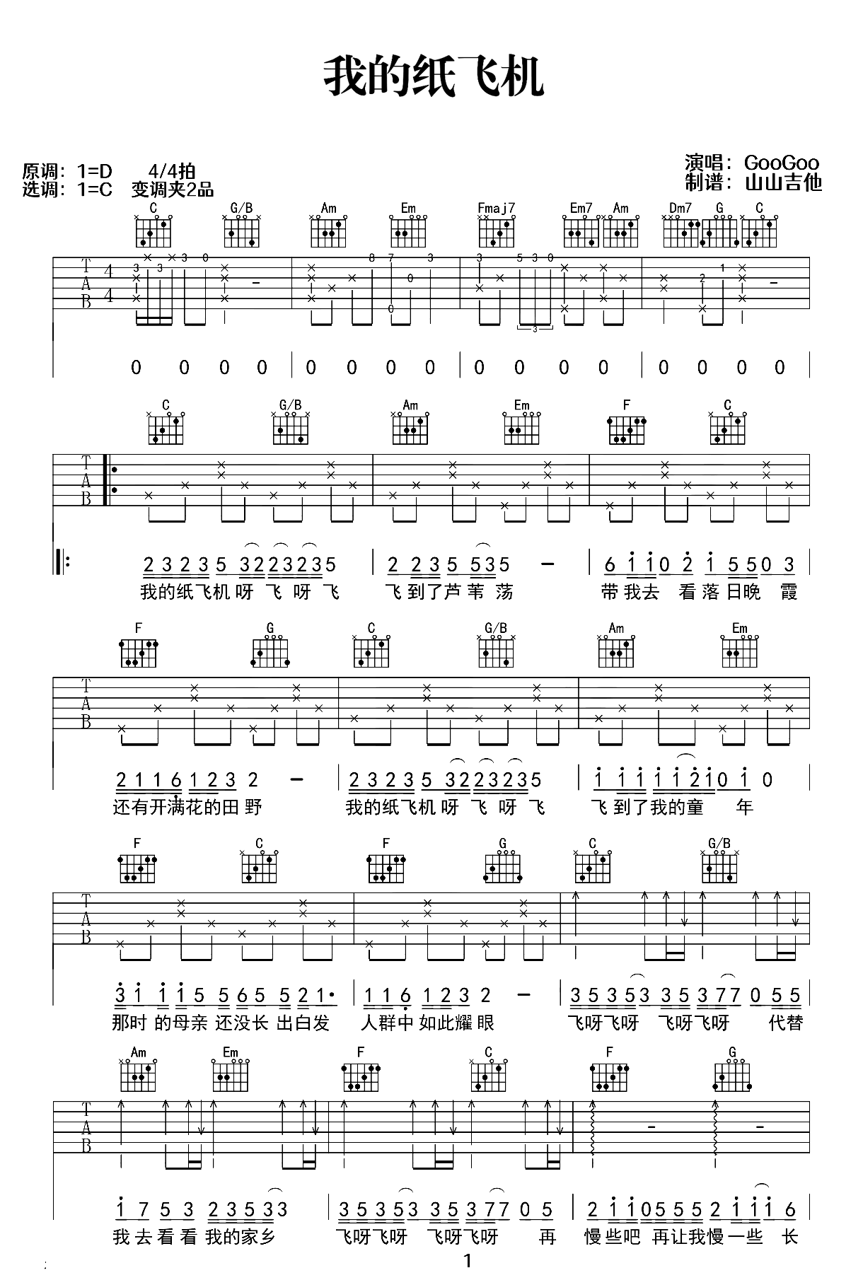 我的纸飞机吉他谱,Googoo/王之睿演唱,一首音乐排行榜居高不下的热门歌曲。《我的纸飞机》吉他弹唱谱,原调为D调,选用C调指法编配,变调夹夹第二品,4/4节奏,六线谱共两张图片谱,感谢山山吉他制谱出品,酷玩吉他整理上传。 很治愈的一首歌,带我们梦回童年。人生若只如江南...