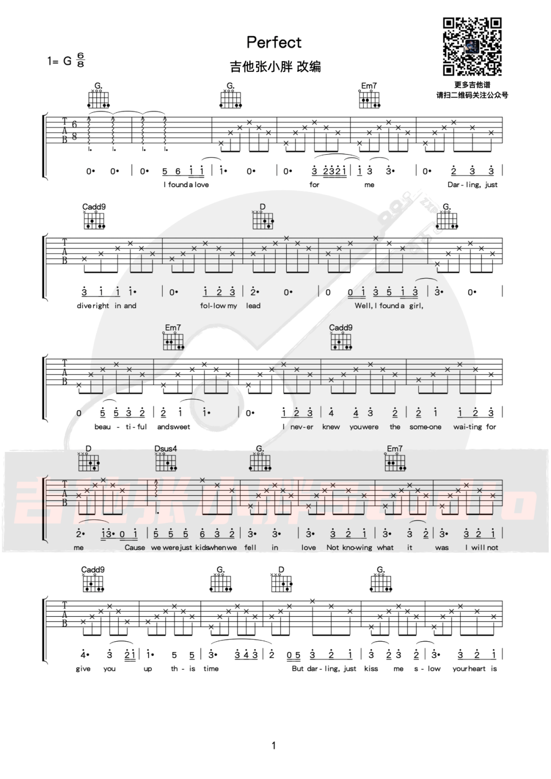 Perfect吉他谱_EdSheeran_G调弹唱谱_高清六线谱《Perfect》吉他弹唱谱,原调降A选用G调指法,变调夹夹一品。完整版共五张图片六线谱分两页显示。...